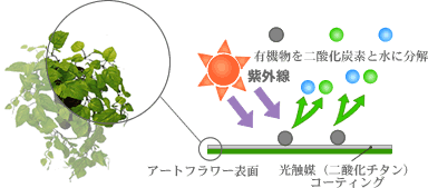 | 枯れることなくいつまでも美しさを保つお花ですので、素敵なインテリアとしてお部屋に装飾できます。 お花の表面など光触媒(二酸化チタン)のコート面に太陽光線や蛍光灯の紫外線があたるだけで、シックハウス症候群の要因となるホルムアルデヒドや煙草の臭いの成分であるアセトアルデヒド、ペットの臭いの成分である アンモニア等の有害物質を酸化分解、吸着分解して、除菌、抗菌、消臭の革命的な3つの環境浄化作用をもたらします。 |