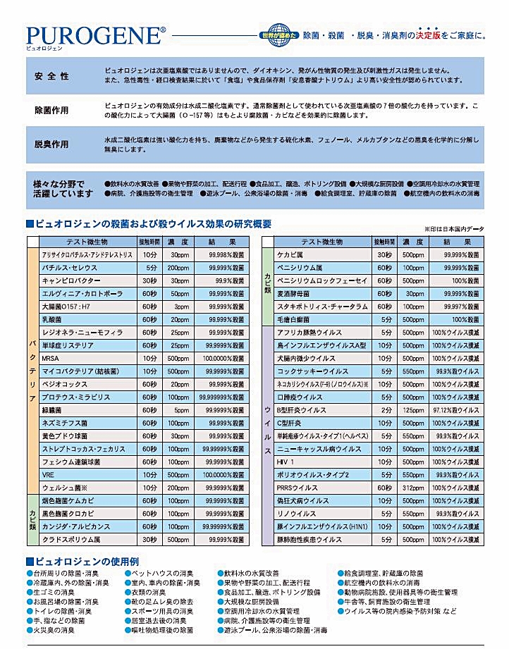 ピュオロジェンは、高い安全性を持った「除菌」「殺菌」「消臭」剤です。